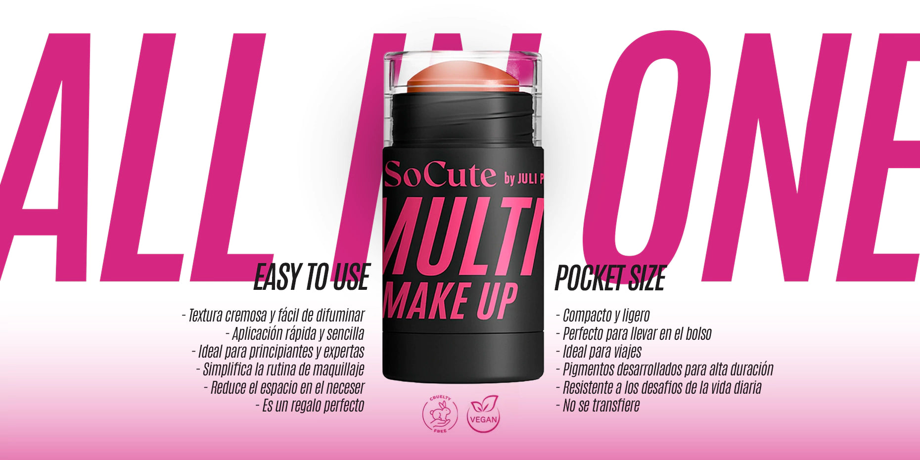 ¡Descubre la magia del Multistick de SoCute by Juli Poggio! Este innovador producto en los colores: Glacial Pink, Cinnamon Glow y Dark Temptation, es la combinación perfecta de color y cuidado, diseñado especialmente para realzar tu belleza de manera rápida y elegante.